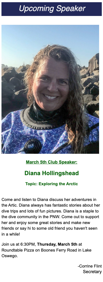 She is passionate about safe diving practices and has completed over 6,500 dives, primarily in the waters of the Pacific Northwest. She also volunteers extensively with organizations such as the Oregon Coast Aquarium and is a frequent speaker and educator. In 2008, Diana established "Dive for a Cure," a fundraising initiative focused on breast cancer research, raising over $560,000 for the OHSU Knight Cancer Institute. Her presentation at our club meeting on "Dive for a Cure" will encompass the history of the program, its mission, and its success in raising funds for breast cancer research. She will also highlight the importance of individual involvement in supporting such causes.